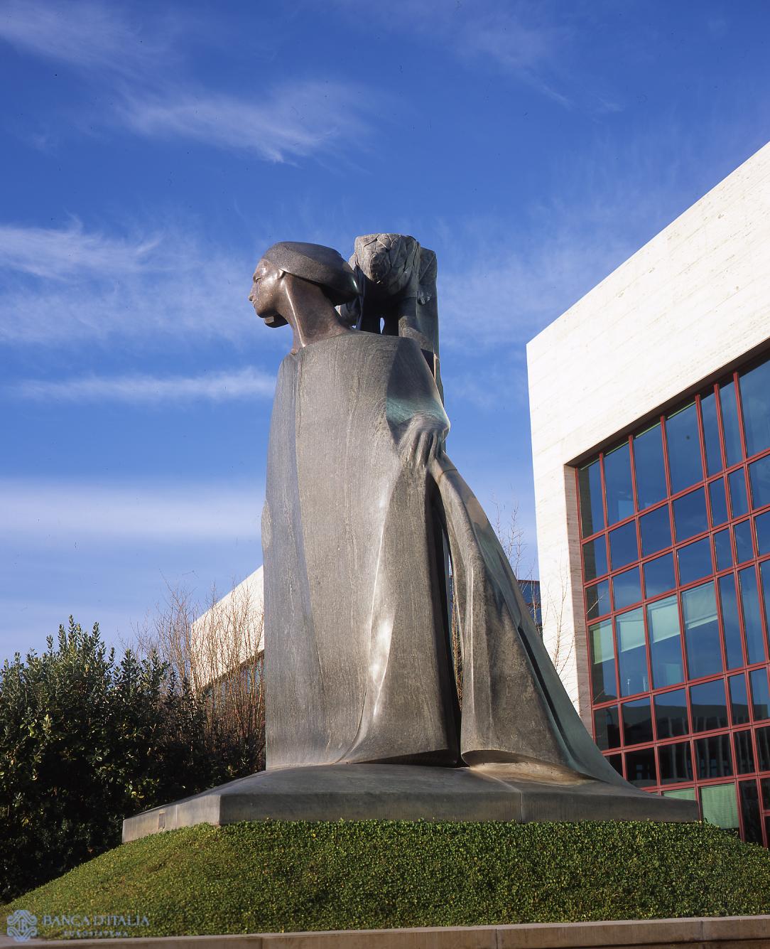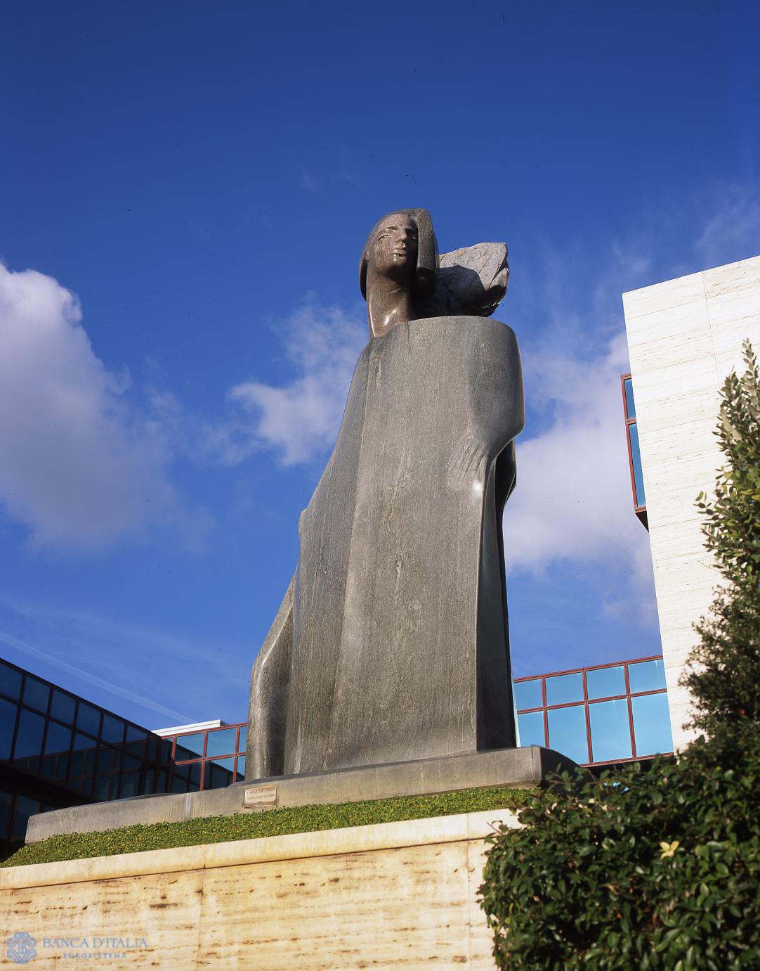 On a base of the same material, this polychrome marble figure (green Guatemala marble, the face in multicoloured juparanà, part of the tree behind the head in dark green serpentine) dominates the broad courtyard at the heart of the Bank of Italy’s Donato Menichella Centre in Vermicino near Rome. The woman, in a flowing cape, isolated and distant, solemn as a goddess, stands as the guardian of the place. The light blue marble highlights the potent volume, standing out against the light travertine buildings. The monolithic volume of the sculpture has cuts and gaps, brusquely interrupting its flow. The form is moved by the sudden openings in the stone, with deep fissures or sharp out-juttings. The lines that accompany the figure outline its profiles delicately, and the modeling is soft, so that the marble in which the form is sculpted seems to be ductile material, like clay. “What I am interested in”, says the artist, “is interrupting certain volumes without touching the form, in such a way that the work remains monolithic. This way, you get a sort of visual cut that imparts movement and speed to the figure. The light that plays over the surface, leaving some parts in shadow, and the sense of the opening and closing of the volumes is like perceiving the scent of things”. The woman is leaning against a tree, one of Vangi’s recurrent themes. The tree is detached from the volume of the figure, with the colour contrast of its leafy crown.