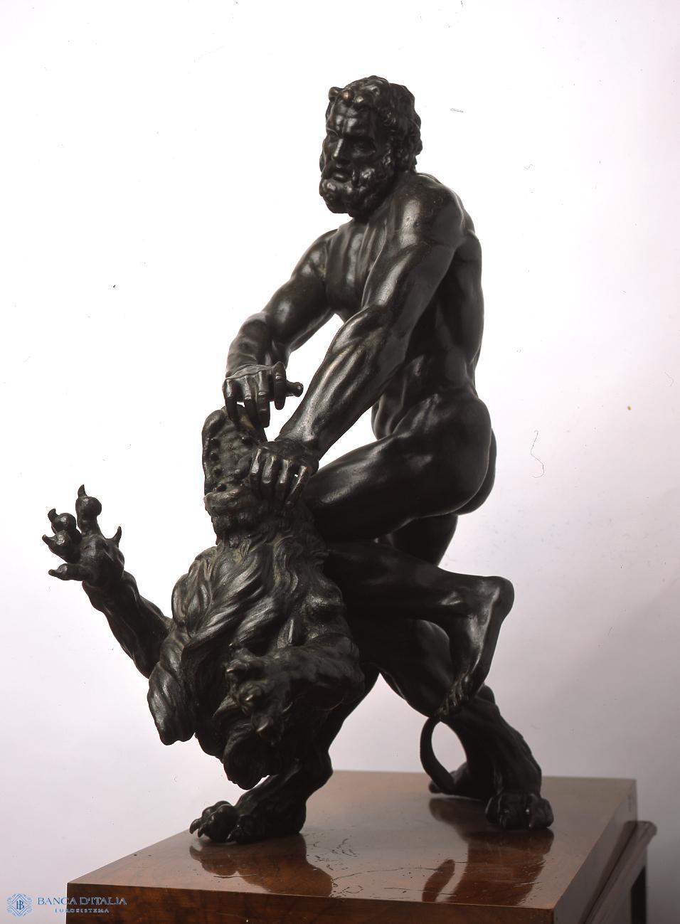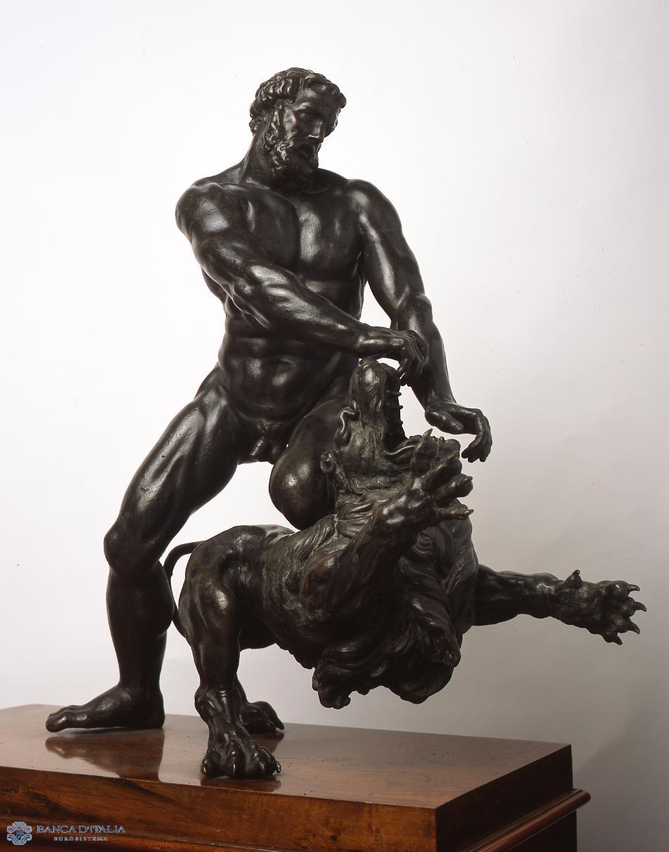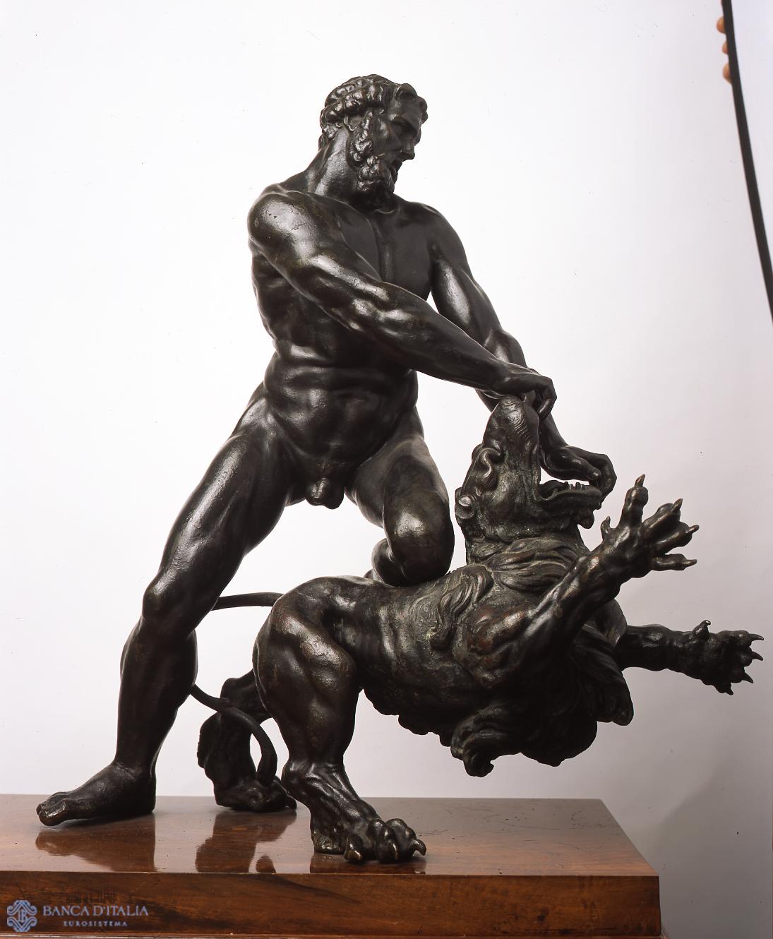 Questa tematica, già presente nell’arte fiorentina del Quattrocento, venne ripresa da Giambologna e dalla sua bottega in numerosi bronzetti realizzati tra la seconda metà del XVI secolo e l’inizio del XVII. Affascinato dall’arte di Michelangelo, l’autore di quest’opera, rappresenta un Ercole dalla muscolatura gonfia, ravvivando anche l’interpretazione neoplatonica del mito: la ragione umana che si impone con vigore sulla ferocia del mondo animale. La figura del leone rinvia, per la sua posa, ad una delle più celebri sculture etrusche allora note, la chimera bronzea scoperta ad Arezzo nel 1553.