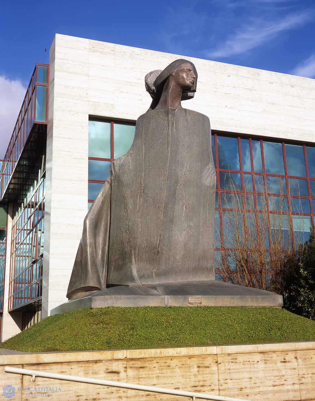 Issata su un basamento della stessa materia, la figura in marmo policromo (marmo verde Guatemala, viso in juparanà multicolor, parte dell’albero dietro la testa in serpentino verde scuro) domina l'ampia corte che si apre nel cuore del nuovo Centro Domenico Menichella a Vermicino, collocato ai piedi dei colli Albani. La donna avvolta nell'ampio mantello, isolata e distante, solenne come una dea, è a guardia del luogo. Il marmo azzurrino ne fa risaltare il volume possente a riscontro degli edifici in travertino chiaro. Il volume monolitico della scultura presenta tagli e scarti che lo interrompono bruscamente; la forma è mossa da questi improvvisi sfagli della pietra che si apre in fessure profonde o in aggetti pronunciati. Le linee che accompagnano la figura ne delineano i profili con delicatezza e il modellato è morbido, tanto che il marmo in cui è scavata la forma sembra materia duttile come creta. La donna è appoggiata ad un albero, secondo una tematica ricorrente nella produzione di Vangi. L'albero si stacca dal volume della figura con il contrasto cromatico della sua chioma.